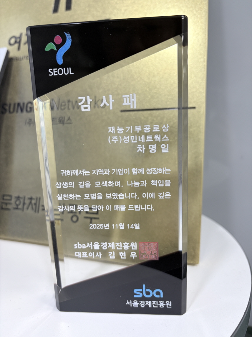 성민네트웍스 차명일 대표이사가 지난 11월 14일, 서울산업진흥원(SBA)이 주관하는 ‘SBA 재능기부 공로상’을 수상했습니다.